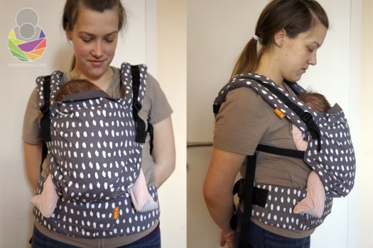 Unlike with other similar carriers, baby’s bottom doesn’t fit deep into the panel and the hip area is only supported in three points: the center of the bottom and both knee pits. The thighs remain visibly unsupported, even in the official photos at babytula.eu. The promotional videos feature only babies in cloth diapers and I have also noticed they help fill the excess space in the panel.