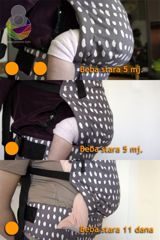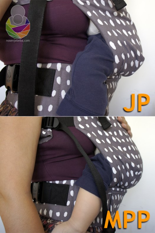 Spomenula sam već da bebina guza upada plitko u panel u odnosu na slične nosiljke i da kukovlje ima potporu u samo tri točke: vrhu guze i iza koljena pri čemu bedra ostaju bez potpore, a taj dio nosiljke ostaje “prazan” čak i na Tulinim fotografijama na njihovoj stranici babytula.eu. Primjetila sam i da bebe s debelom modernom platnenom pelenom (MPP) na guzi bolje “sjedaju” u panel u odnosu na bebe s tankom jednokratnom pelenom (JP). Zanimljivo jest da u Tulinom promo videu sve bebe imaju velike guze zbog debelih MPP.