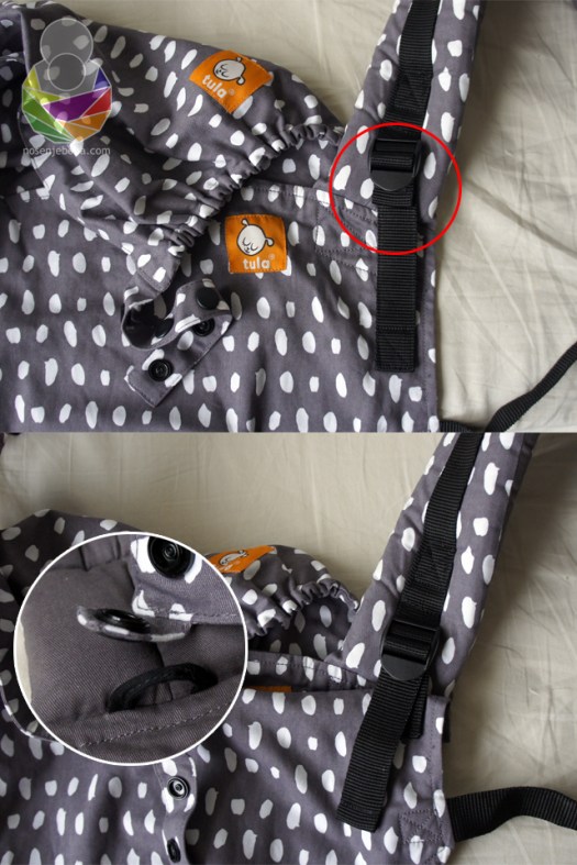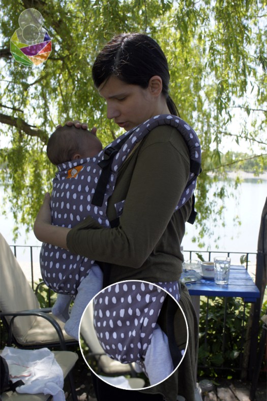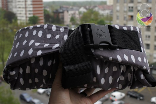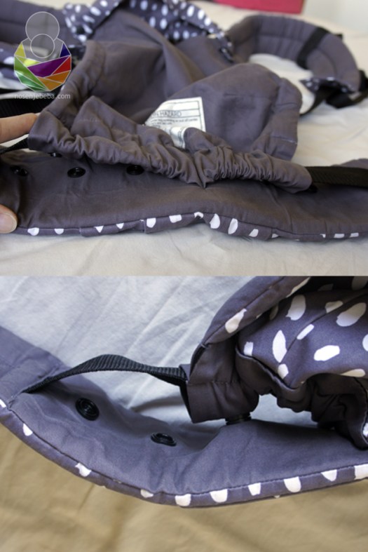 The hood is no longer attached to the panel with snap fasteners, but is inserted through a canvas hoop and snapped in place, which makes losing it less likely. There is a wide strap going through the bottom of the panel, with three fastener snaps on each side. The snaps are used for panel width adjustment. Again, a solution that we have already seen on other carriers, like the Beco Gemini, but I am aware that originality is difficult to achieve in the 21st century. Maybe we’ve simply reached the pinnacle of structured carrier design.