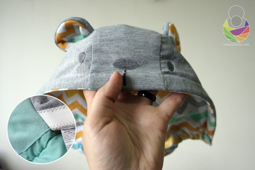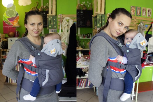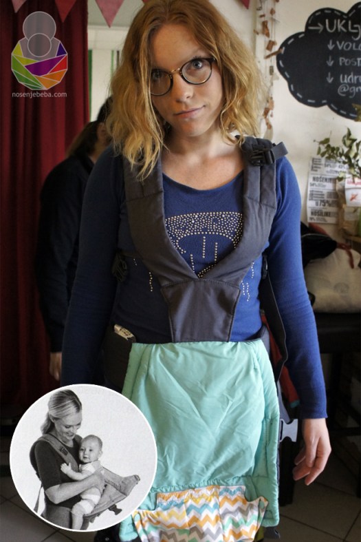 O ovoj upadljivoj “samostojećoj” kapuljači s početka priče mogu reći samo to da bebama starijima od 6-8 mj. u nju više ne stane glava. Ona nije zamišljena kao potpora za glavu uspavanoj bebi kao na tipičnim mekim oblikovanim nosiljkama (eng. SSC-  Soft Structured Carrier) nego samo kao zaštita od vjetra i sunca (nema UV zaštite). U rubu kapuljače je žica koja joj drži oblik pa podsjeća na “push up” grudnjak.
