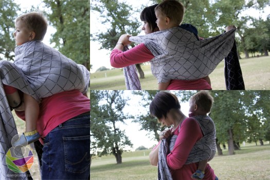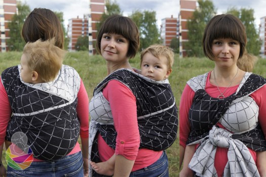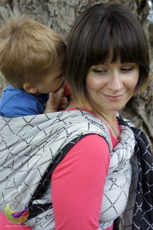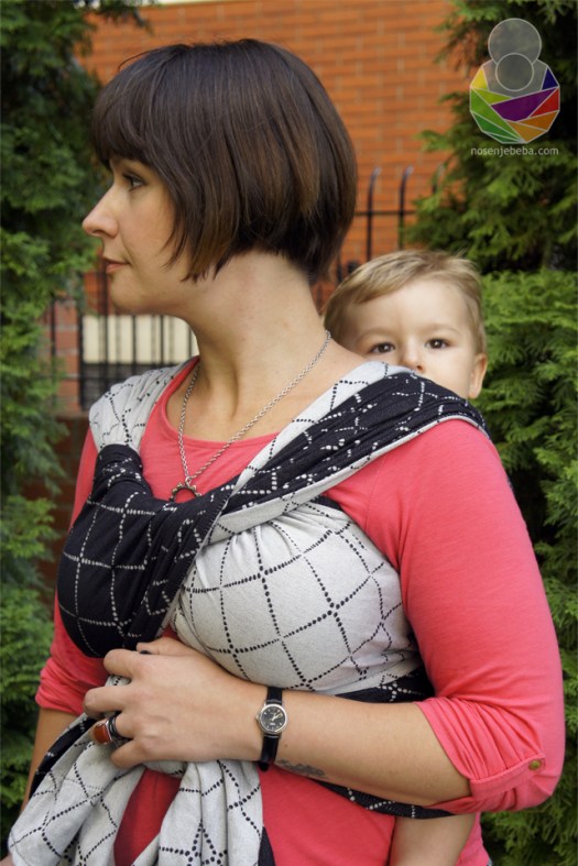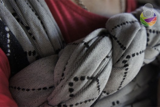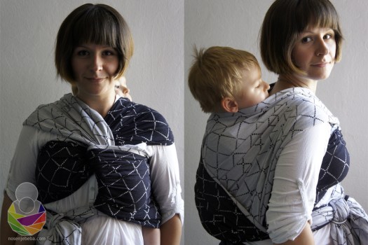 This wrap shows its full charm in carries where both of the strongly contrasting sides with a striking geometric pattern are visible. It is hemmed lengthwise in a way so that both sides can be right, and the contrasting visible hem helps distinguish the upper edge from the bottom one. Visible middle markers with Isara’s logo are easy to feel under the fingers. The instructions and warnings for the American market are printed on soft textile and placed along the hemline of the wrap, and can not be easily cut off because the label is sewn on all four sides. The big label does not interfere with wrapping in any way because it glides with the weave’s movement. It could easily be removed without damaging the wrap, but you must know that the removal of labels will lower the price of your wrap on the second-hand market. The ends of the wrap are diagonally trimmed (tapered) for a smooth drape of the fabric, which is a standard for most machine woven wraps.