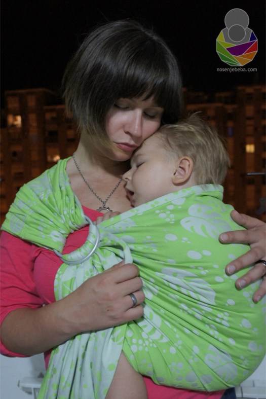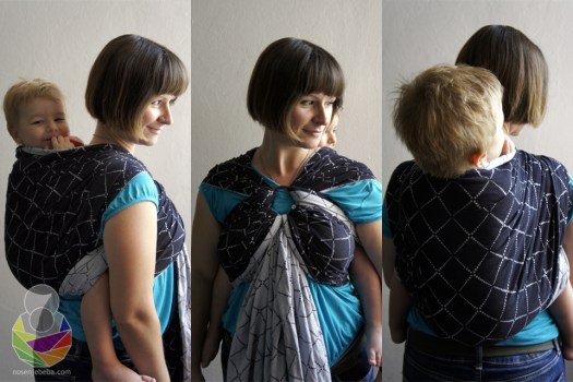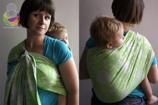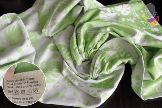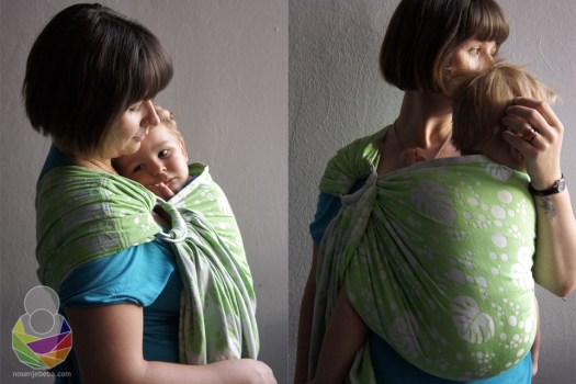 The ring sling Philodendra is a size 1 with a length of 195cm/207cm (reverse side). It is reversible, with a green “right” side and a white “wrong“ side. Philodendra has a fun and interesting pattern with philodendron leaves and circles. The gathered shoulder is very comfortable, fits great and follows the body movement. Even before it is broken, the ring sling tightens easily and passes smoothly through the rings. The dense weave holds a heavy toddler bottom in place, without stretching or forming into a deep “pocket”. The fabric is shiny and silky, while being lightweight and velvety to the touch. Just like on the woven wrap, the hem was made diagonally (tapered) so the fabric would drape nicely.