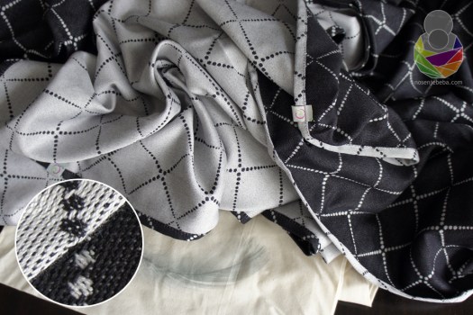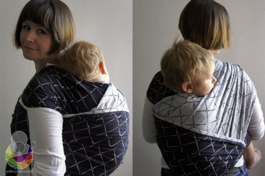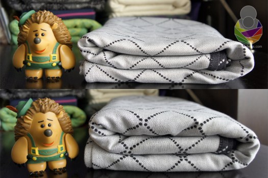 The Diamonda woven wrap (size 6; 4.6 m) has a dense weave that nonetheless enables softness and excellent diagonal stretch. It has almost no stretch, which makes it an excellent wrap for toddlers, even in singlepass carries. It is self-pleating and very cushy on the shoulders, and forgiving in a sloppy wrap job. Due to its softness, it is a great choice for newborns as well. It glides into place in multipass carries thanks to the velvety texture of the black side and the soapiness of the white side. It holds slipknots, knotless and ring finishes in place without slipping. The Diamonda feels light and very fluid to the touch. The knots it produces are smaller than one would expect from a medium high density weave. This is not surprising since Monica Olariu, the designer and woman in charge at Isara, had been looking for the perfect weave, loom and threads for years.