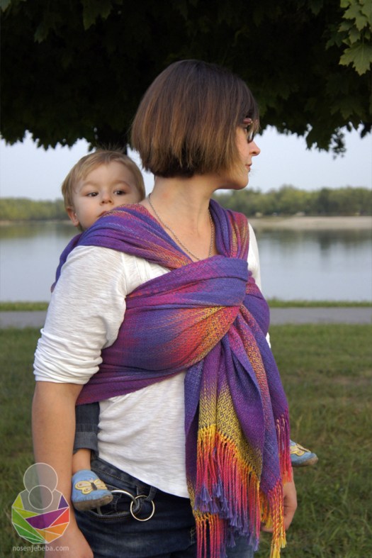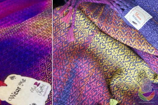 This time I have the pleasure of reviewing a custom handwoven wrap made just for me. Milana (Mima) Latinović can weave a babywearing wrap in any given length and width, and offers a wide range of custom details like a differently colored hem, handpainted weft and warp, various blends, GSMs and weaves. Even the middle marker can be custom made (embroidered, sown or woven), and there is the option of fringes. Everything is made according to the buyer’s wishes, with the weaver’s personal signature remaining intact.