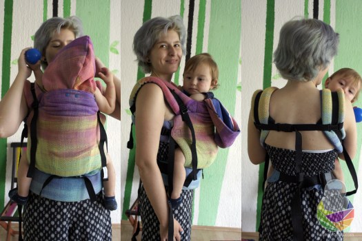 The wrap excells in both single and multipass carries. Each pass is easily tightened, slides into place and supports the baby’s weight without creating slack during wearing. It is forgiving with very sloppy wrapjobs. What immediately catches the eye is just how wonderfully the wrap pleats iself.