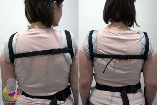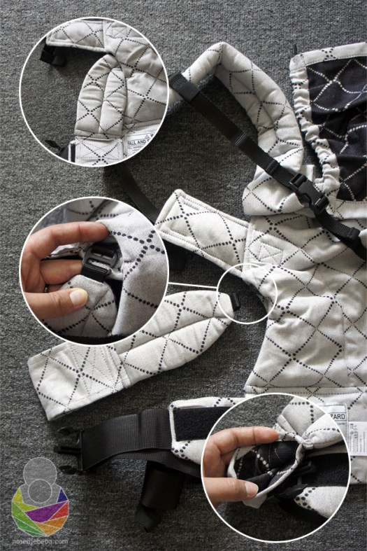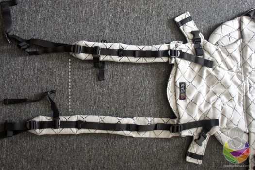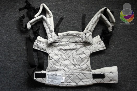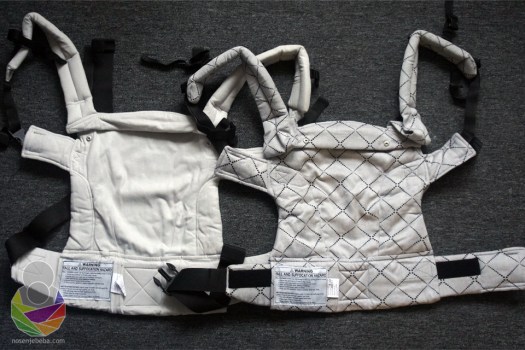 U oko odmah upadaju nove značajke u odnosu na V3 model: panel je strukiran, ušitci su izuzetno duboki (najdublji koje sam ikad vidjela!), rubni dio je cijeli obložen s obje strane, pojas je mekši, na naramenice su uz dvosmjerne kopče dodani i zatezači, kapuljača izgleda drugačije, postoje i proširivači pojasa (“pretvarači” iz baby veličine u toddler), dvosmjerni zatezači iznad panela (jedan smjer je za skraćivanje/ produljivanje naramenica a drugi smjer je za skraćivanje/ produljivanje panela).