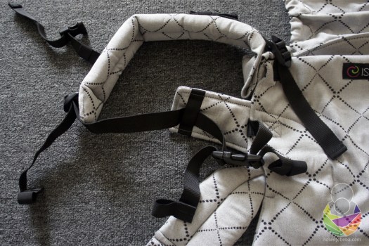 I quickly noticed many differences compared to the V3 – the panel is narrow at the waist, the plackets are extremely deep (the deepest I’ve seen!), the whole edge is padded from the inner and outer side, the waistbelt is softer, the shoulder straps have two-way buckles and added webbing adjusters (thus enabling adjustment of shoulder straps in three directions), the hood looks different, the width of the waistbelt is adjustable (for conversion from baby to toddler size) and there are two-way webbing adjusters above the panel, the so-called “shoulder transformers”. You can adjust the length of the shoulder strap using an adjuster in one direction (even if the baby is already on your back!), and then use the same adjuster to adjust the panel length. The V3 has a straight panel with a minimum length 2 cm longer than the panel on The One. The V3 has a shock-absorber on the chest strap, just like military backpacks. The One has a longer chest strap with two-way cinching. You can also adjust the length of the shoulder straps depending on how tall you are or how high you wish to carry your baby.