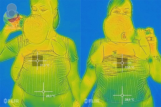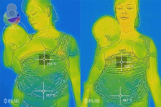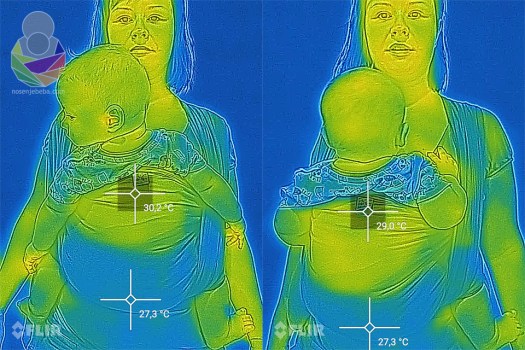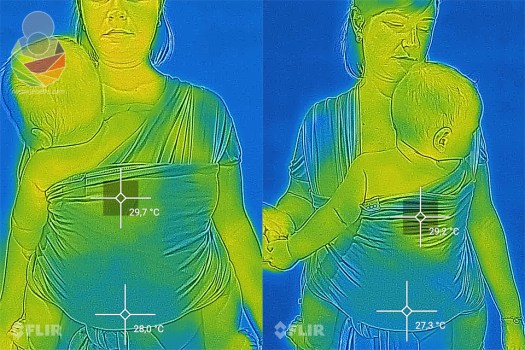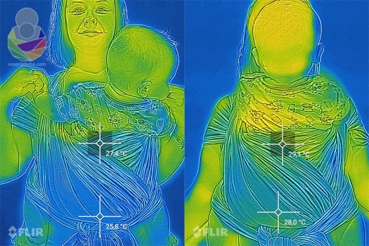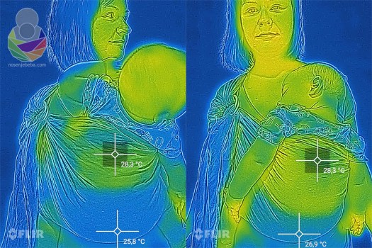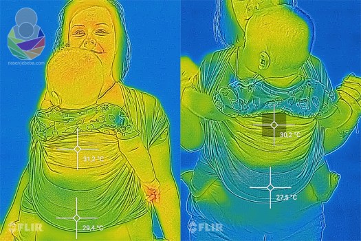 Metoda se nije bitno mijenjala. Svaki sling ili maramu postavila sam s bebačem na sebe i u roku od pola minute napravila prvi snimak toplinskog zračenja, zatim nakon točno 10 minuta napravila drugi snimak da provjerim koliko smo se ugrijali. Bila sam kod kuće, na stabilnih 28 ºC i relativnoj vlažnosti zraka od sparnih 85%. Između promjene nosiljaka imala sam pauze od 20 minuta. Bebač je na sebi imao platnenu pelenu i pamučni kombinezon a ja pamučnu majicu s kratkim rukavima. Snimala sam s preciznom FLIR termovizijskom kamerom.