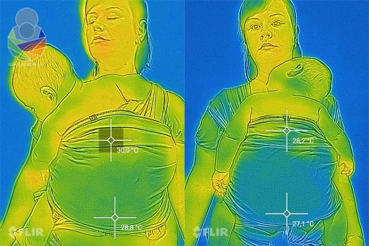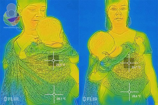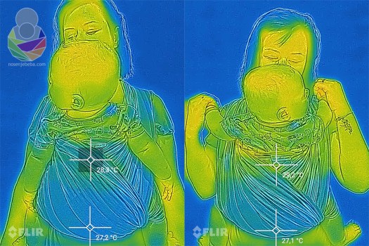 Konoplja je materijal koji ima lošu toplinsku vodljivost (tek 0.039 W/m°K radi čega se i koristi kao izolator), no rahlo tkanje može itekako prevagnuti u izmjeni topline nad samim svojstvima materijala. Vrlo gust, težak sling od 25% konoplje u sastavu i laganiji, no zbijenije tkani sling s također 25% konoplje u sastavu slično griju zbog toga što su u jednom sloju preko nositelja i nošenčeta. Rahlije tkani sling je ipak malo prozračniji od onog tkanog zbijenije. U zbijenije tkanom slingu bilo mi je osjetno toplije, mada FLIR termovizijska kamera i nije zamijetila značajno odstupanje. Od samog sastava i težine tkanine bitnija je rahlost tkanja, tj. zbijenost samih niti u tkanju o čemu u konačnici ovisi i prozračnost i izmjena topline.