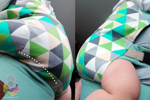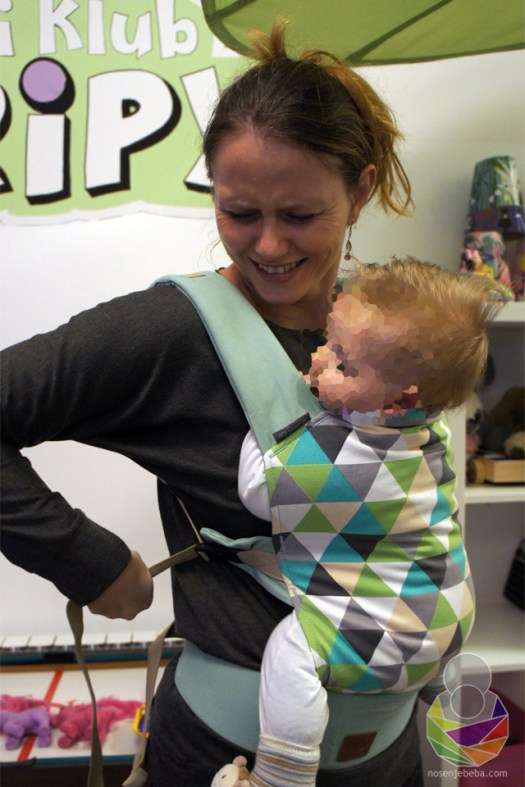 Svaku nosiljku treba za svako nošenje podesiti: namjestiti pojas na dobru visinu, stegnuti, zategnuti naramenice. Eh, na ovoj nosiljci nije moguće pomaknuti kopče pa se tako nosiljka može zatezati jedino tako da se gurtne vuku prema iza. Nije taj smjer ništa neobično za Ergobaby Adapt ili Omni, Ruckeli, Isaru, Bobu X i cijeli niz nosiljaka, no Kinderkraftova kopča nije sprijeda na panelu, niti uz sam panel, nego je na boku. Tako ruka nema dovoljno mjesta ni snage da se gurtna stegne bez posebnog napora. Bojim se da će ovo natjerati roditelje da nose bebe u labavoj nosiljci i da bi radi toga moglo dolaziti do posjedanja bebe. U svakom slučaju ovo nije nosiljka za novorođenčad.