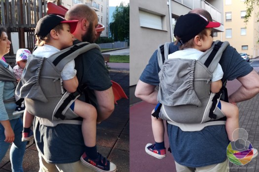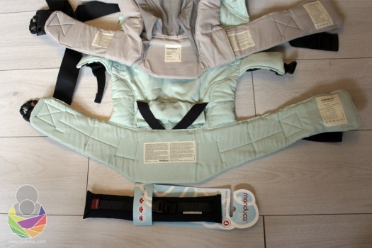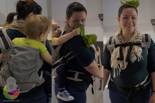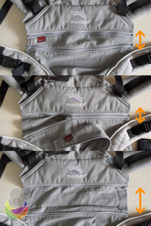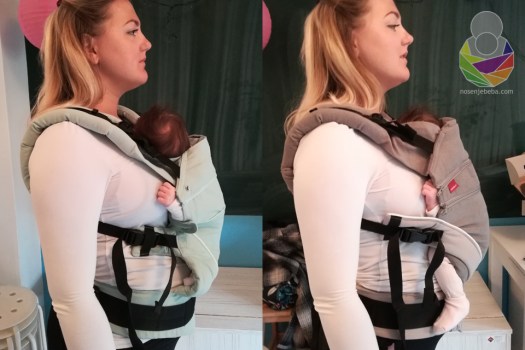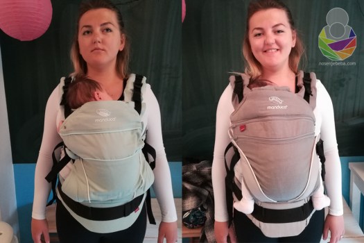 Sama duljina panela bolja je u Manduci First dok je beba u “gaćicama”. Model XT sam namjestila na srednju visinu panela; dakle paneli su jednako visoki u obje nosiljke. Razlika je u tome što u Manduci First beba nasjeda prvo u “gaćice” što ju podigne više, a u XT modelu beba upada dublje u panel i panel pokrije cijela uha. Na najkraćoj visini panela čini se kao da beba nema dovoljno potpore za glavicu jer joj jedva dođe do uha. Naravno s Manducom niti to nije problem jer se tome lako može doskočiti s kapuljačom: kad je beba budna ona se može zarolati za bebin vrat.