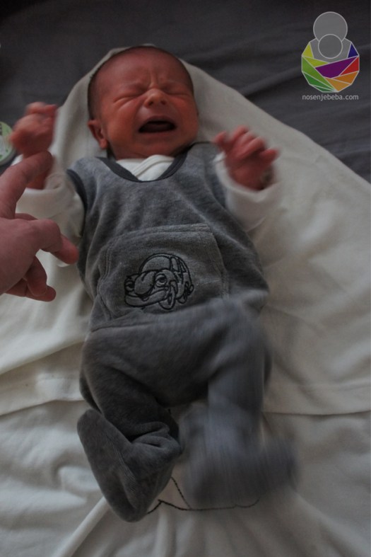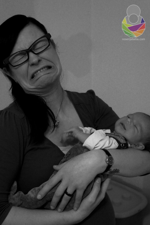 Nošenje nam je prvih mjeseci bilo stvarno iz nužde. Nisam na umu imala praktičnost nošenja, slobodne ruke i prekrasnu vještinu koja mi je trebala omogućiti privikavanje na ulogu majke i povezivanje s bebom. Htjela sam samo da sve čim prije prođe. Dobivao je na težini usprkos toliko povraćanja, s mlazovima i po dva metra u dalj, zahvaljujući vrlo čestim i prekidanim podojima. Nije smio imati pun želučić jer bi mu želudac sve istisnuo van kroz otvoreni sfinkter, čim bi kroz dvadesetak minuta krenuo probavljati moje mlijeko. Česti i kratki podoji držali su pod kontrolom oštećenu sluznicu jednjaka. Bez nošenja bismo prvih šest mjeseci proveli zatvoreni u stanu, cijeli dan prikovani za krevet. Strah me i pomisliti kako bi se to odrazilo na tada već moje jako narušeno mentalno zdravlje. Ozbiljno sam razmišljala o prestanku dojenja, mada sam bila svjesna da bi zamjensko mlijeko pogoršalo refluks. Nesanica je stoljećima bila vrlo popularno sredstvo za mučenje. Naravno mene nitko nije sustavno, ciljano i namjerno mučio, no rezultat je bio isti. Osjećala sam se beznadno, samo, izolirano, osjetljivo, razdražljivo. Noću bismo se ponekad uspjeli odvojiti, i to samo ako ne bi primjetio da se odjednom našao na svom tati. U rijetkim trenucima kad bi uopće bio u svom krevetiću morao je biti na boku, sa velikim srolanim ručnikom iza leđa i između nogu, da se ne bi okrenuo na leđa i ugušio u snu. Zahvaljujući nošenju i mojoj tvrdoglavosti izbjegli smo veće probleme i pijenje blokatora kiseline, operaciju želuca i prestanak dojenja. Vjerojatno i moje dobrovoljno prijavljivanje u psihijatrijsku ustanovu, samo da se naspavam.