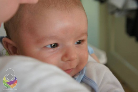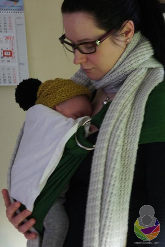 U slingu sam ga znala nositi i preko dvanaest sati dnevno. Osobni rekord mi je bio dvadeset sati. Naravno vadila sam ga iz slinga radi promjene pelene, oboružana tetra pelenama i ručnicima jer bi tada kiselog mlijeka i sira bilo posvuda. Dojio je gotovo isključivo u slingu jer bi mi inače povraćao u grudnjak, ako bih ga netom podojenog stavljala u sling. (Mada sam stalno smrdila po kiselom siru i usprkos razvijenim strategijama). Kada je bio u slingu trudila sam se da je u istom položaju u kakvom bi bio na podu, da je mogao biti na podu bez povraćanja: u dubokom čučnju, s koljenima iznad guze, kao u Pavlikovim remenčićima. Ruke su mu bile uz tijelo i savijene u laktovima, sa šakama blizu lica. Nažalost ovaj idealni položaj tijela nisam mogla uvijek ostvariti u slingu zbog njegovog tipičnog refluksičnog izvijanja, vrlo sličnog hipertonusnom. Većinom je ipak bio u idealnom položaju. Motorički je bio ispred svoje dobi, što je i očekivano, budući da je rođen kao (pre)zrela beba u 43. tjednu.