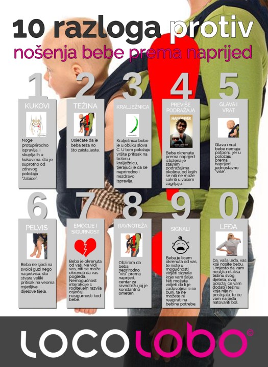 Po Facebook grupama se vrlo često pojavljuje PixieKidova, tj. LocoLobova infografika u kojoj je navedeno 10 razloga protiv nošenja bebe okrenute prema naprijed, uz prateći kontroverzni uvod u kojem se tvrdi i da je tzv. “Buddha” položaj (poznat i kao “kangaroo position“) zdraviji za kukove od onoga u kojem “nogice vise”.