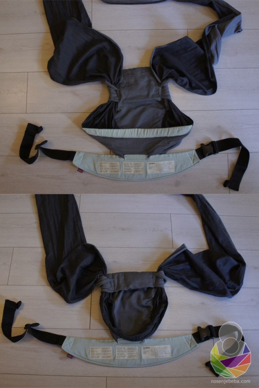 U oči odmah upada “zdjela” u koju se smješta beba. Ovo neobično sjedište treba smanjiti presavijanjem rubova prema van, tj. od naličja prema licu nosiljke. Na taj se način ono smanjuje i prilagođava i za najmanje bebe (no ne lakše od 3.5 kg, mada mi se čini da bi ova nosiljka mogla biti odlična i za prijevremeno rođene bebe). Na cijeloj nosiljci nema čičaka, drukera, gurtni, uzica, ni prstena. Na mekanom pojasu je samo jedna kopča, i to je sve. Sjedište u obliku zdjele me podjeća na Cybexovu nosiljku BEYLA.twist. Zapravo to je odlično dizajnersko rješenje koje odlično oponaša duboko sjedište kakvo daje sling.