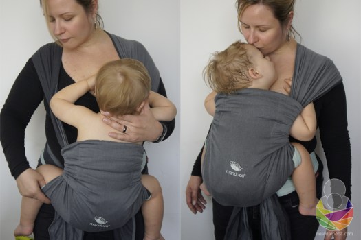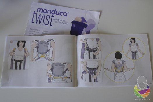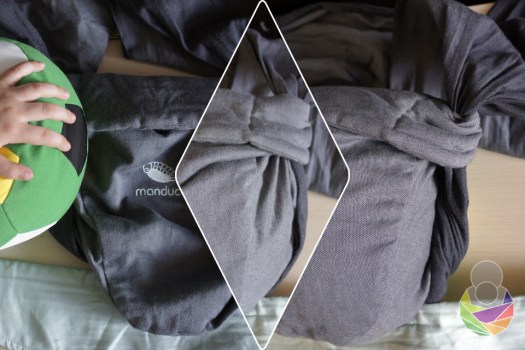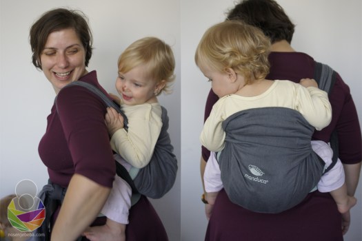 S obzirom na to da sam pojas podignula iznad struka, odmah ispod grudi, on zaista nije mogao ići još više. Čelo demo lutke nije doseglo moj vrat, dakle ne bih mogla niti čuti, niti osjetiti disanje prave bebe. Beba je u Manducinim uputama još niže od ovoga. Vjerujem da se ovo “manje bebe” ne odnosi na bebe mlađe od četiri mjeseca, a i to bih naglasila s velikim oprezom budući da nošenje na leđima jako potiče na kretanje bebe prema naprijed (gmizanje, puzanje, hodanje) u dobi kad treba savladati rotaciju trupa, a zatim i okretanje. Vjerujem da će oni rijetki kojima će ova mogućnost zaista i trebati već s bebinih četiri mjeseca da će za to nju imati i dobar razlog: starije dijete, brigu o bolesnom članu obitelji (…) i da će ju prakticirati rijetko i s oprezom prije nego se beba samostalno posjedne.