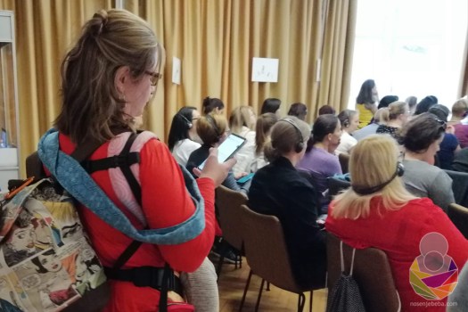 Ugodno me iznenadio. Odlično je podnio putovanje, no cijelo vrijeme su ga mučili zubići zbog čega je bio jako veliki priljepak, a i gužva mu je išla na živce više nego obično. Planirala sam ići na jednu radionicu i sva predavanja, no uspjela sam popratiti samo ona ključna. Kasnije sam čula da su druga predavanja bila namijenjena samo domaćoj publici, usprkos tome što je na raspolaganju bio i prevoditelj. Mađarskoj je ovo bila prva bebonoseća konferencija i čini mi se da zapravo i nisu očekivali strance, naravno osim onih koji su i sponzorirali samu konferenciju i festival: Ergobaby i Didymos. Iskustva sam uspjela razmijeniti samo sa ClauWi savjetnicama iz Bugarske. Mađarske savjetnice su se držale za sebe. Primjetila sam da je razlog tome najviše jezična barijera.