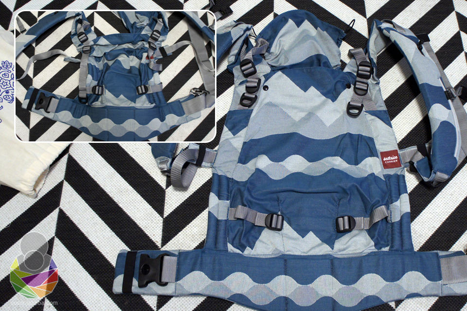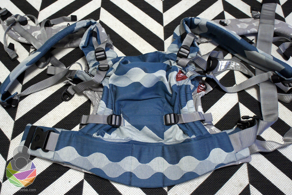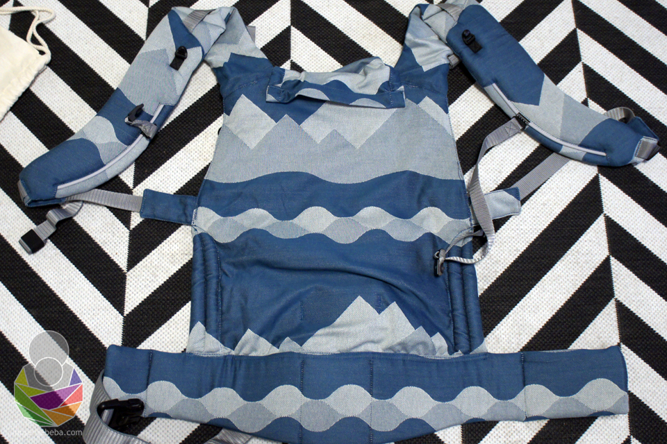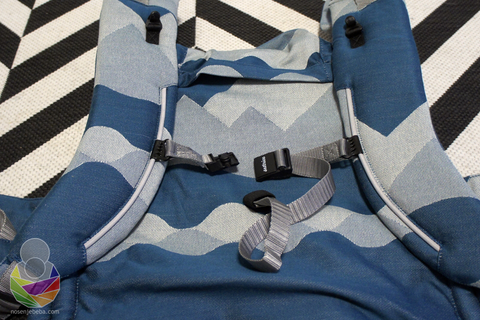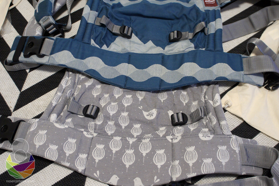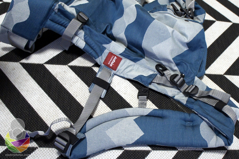 Nosiljka je prilagodljiva u širinu, a istovremeno i dubinu radi položaja gurtni pri donjem dijelu panela, a prilagodljiva je i u visinu. Posebno se prilagođava i duljina naramenica. Obratite pozornost na vrlo duboke ušitke na panelu i kako radi njih i položaja gurtni zapravo otežana demo lutka ne propada preduboko u panel i “lebdi” u prostoru panela iznad pojasa.