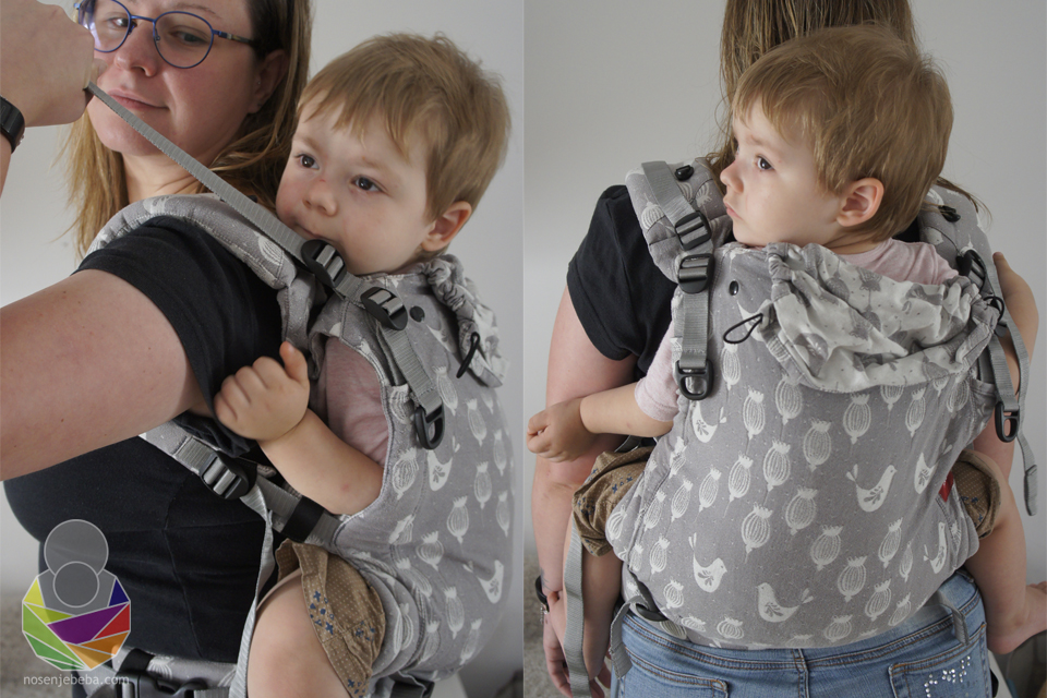 Oko guze demo lutke pojavio se višak materijala kojeg je lako vratiti na mjesto pod pojačanje za nogice (slično kao kod Manduce Twist). Lutka je bila odlično stegnuta preko cijelih leđa panelom nosiljke, a u predjelu vrata se samim skraćivanjem panela gurtnama preokrenuo gornji dio u “kragnicu”. Ovo bi doista moglo biti fantastično rješenje za veće novorođenče ili bebicu stariju od mjesec dana, no treba uzeti u obzir da Sestrice, za razliku od hibridnih nosiljaka namijenjenih baš novorođenčadi i kraćem periodu nošenja, ipak šire nogice.