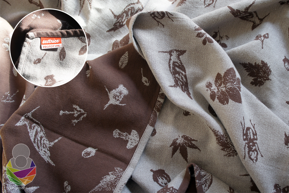 Obje su pamučne i u veličini 6, no razlikuju se tkanjem. Smeđa Forest Oak je prozračnog tkanja, s tri različite niti (dvije u potki i jednoj u osnovi). Radi toga je marama spužvasta, odlične dijagonalne elastičnosti, malčice je rastezljiva, no tek toliko da amortizira, ne urezuje se, no radi i veći čvor. Ljubičasta Herbs Peonies je marama jednostavnijeg tkanja s jednom niti u osnovi i jednom u potki, no nije samo za novorođenčad jer se ponašala odlično i u višeslojnim vezovima s mojim teškašima.