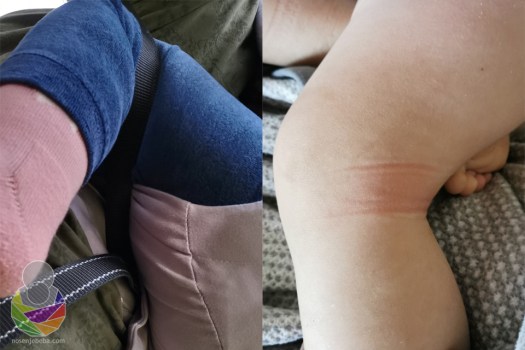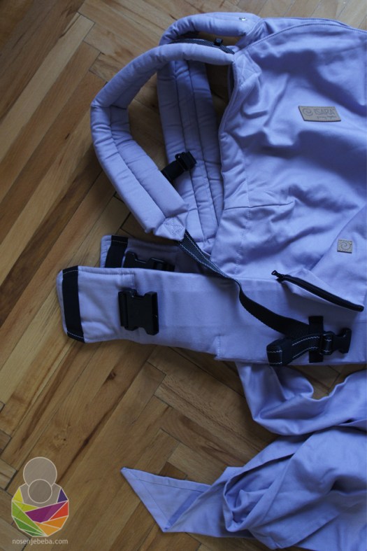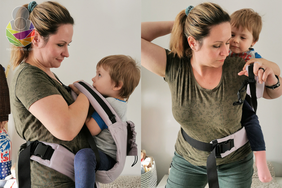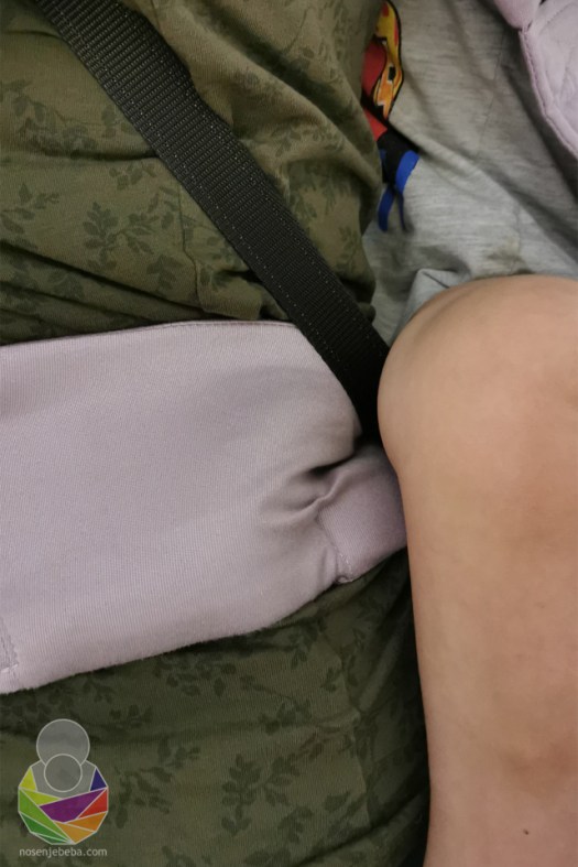 Kopčanje je pomalo neobično ako ste navikli na dosadašnje Isarine modele i treba se sjetiti da se nogice treba provući kroz naramenice, kao kada želite nositi u onbuhimu. Ako gurtna prelazi preko nogice, kao što bi duga traka naramenice u HB inačici, može doći do vrlo neudobnog usijecanja gurtne u nogicu. Naravno isprobala sam to “što ako” i moj malac se jako bunio već nakon nekoliko minuta. Moram napomenuti i da je stariji i puno teži od gegavaca i malih beba za koje je ova nosiljka zamišljena, uostalom jasno je objašnjeno u uputama kako novu Isaru Quick FB treba kopčati. Njemu je Isara HB znatno udobnija i draža.